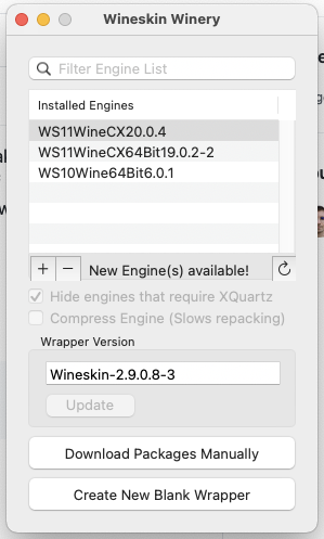 Wineskin Winery 를 잘 사용중이었는데 Big sur 가 업데이트 된 뒤 32bit 바이너리인 wine 을 사용할 수 없게 되었습니다.
